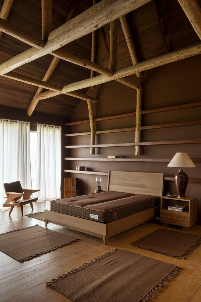 Brown area rugs cover the floor, enhancing the room’s cozy feel, while brown wooden shelves on the walls provide practical storage with a touch of rustic style. A wooden chair in the corner adds versatility, and white curtains near the window let in natural light, balancing the earthy tones with brightness.
