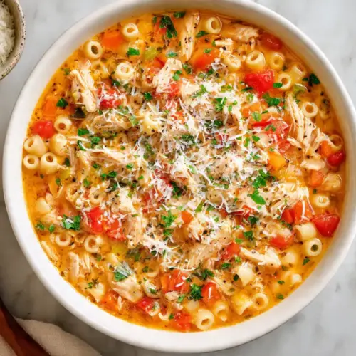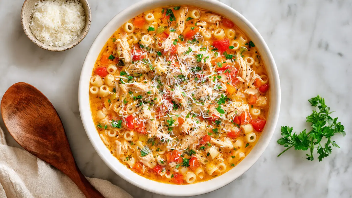 It captures everything that makes the original so irresistible: the hearty vegetables, the spiced-up broth, the tender shredded chicken, and those little ditalini pasta bites in every spoonful.
