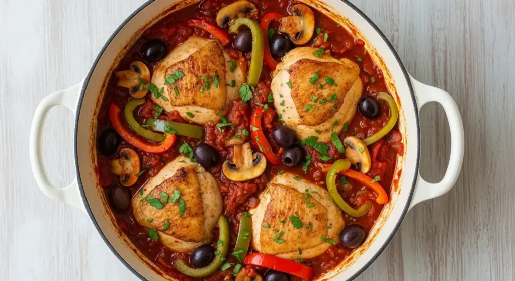 The combination of bone-in chicken, tomatoes, mushrooms, bell peppers, and red wine creates a sauce that is layered, aromatic, and absolutely incredible spooned over pasta, polenta, or crusty bread.