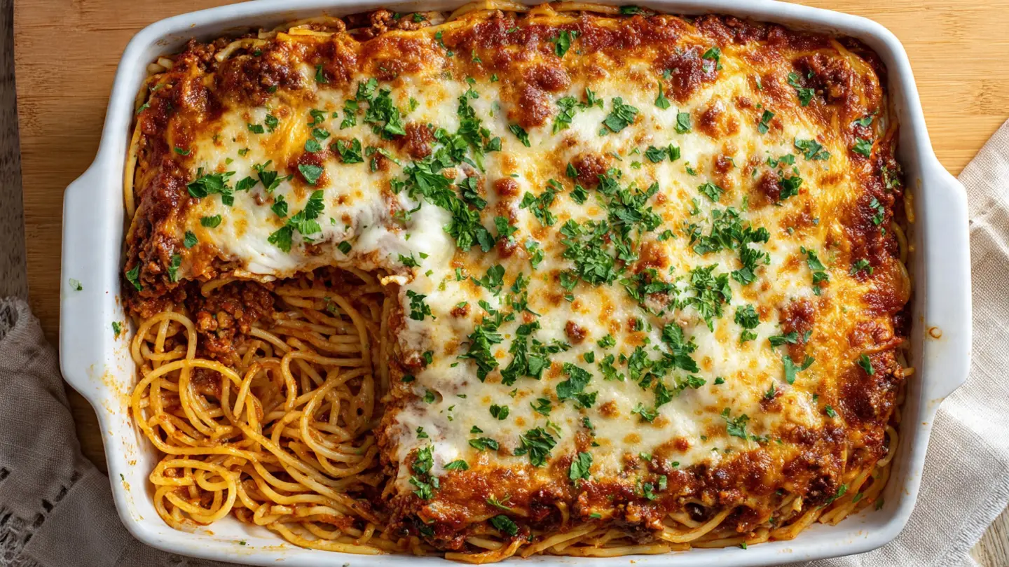 This dish sits somewhere between a bowl of spaghetti and a lasagna, combining tender noodles, a rich meat sauce, and a generous blanket of mozzarella and Parmesan cheese baked until perfectly golden.