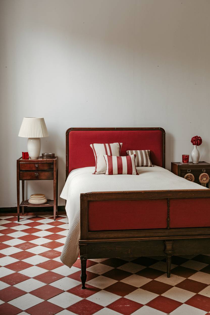Bold and vintage meet in this bedroom featuring a red and white checkered floor. A wooden bed with a red bed frame and white bed cover adds a pop of color, while pillows with white and red stripes and a wooden nightstand with a white lampshade complete the look.
